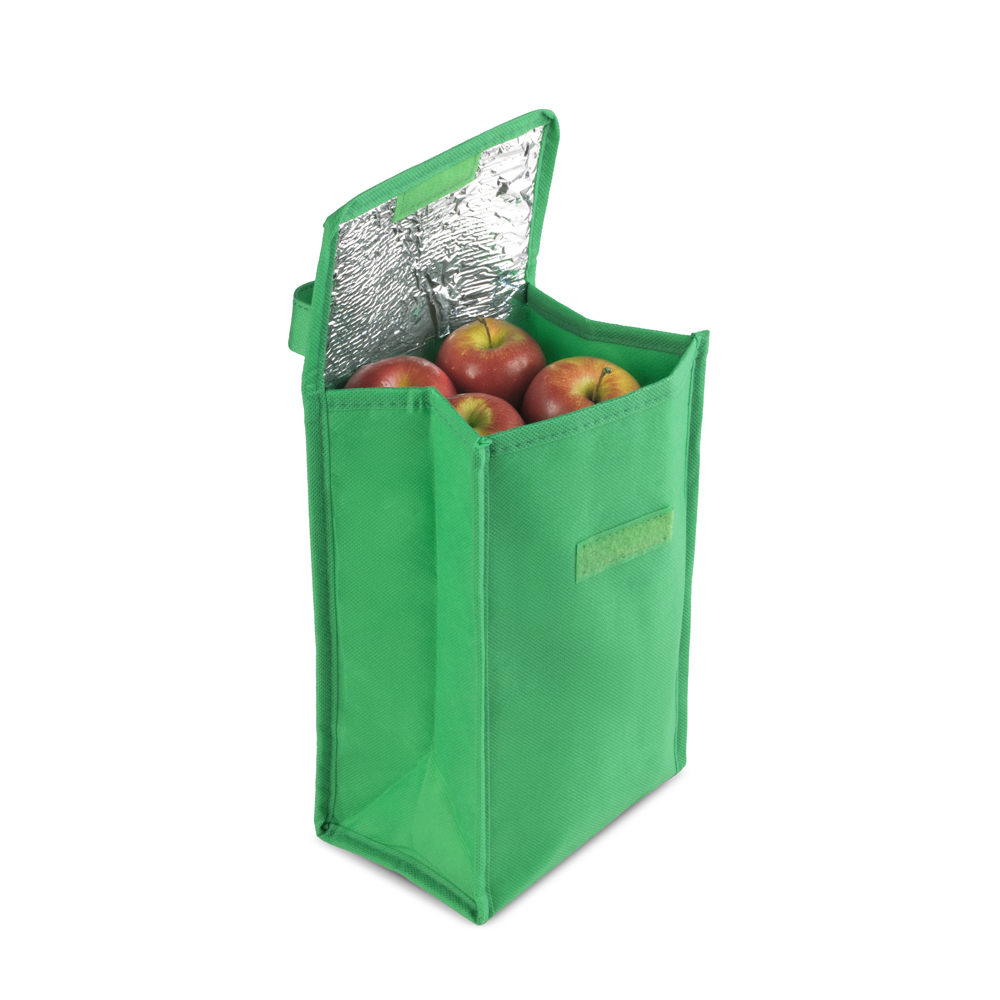 Bolsa térmica personalizada produzida em TNT de 80 g/m², com interior costurado e revestimento em algodão e folha de alumínio de 2 mm, garantindo melhor conservação térmica e resistência no uso. Dimensão do Produto: 28x17x10cm