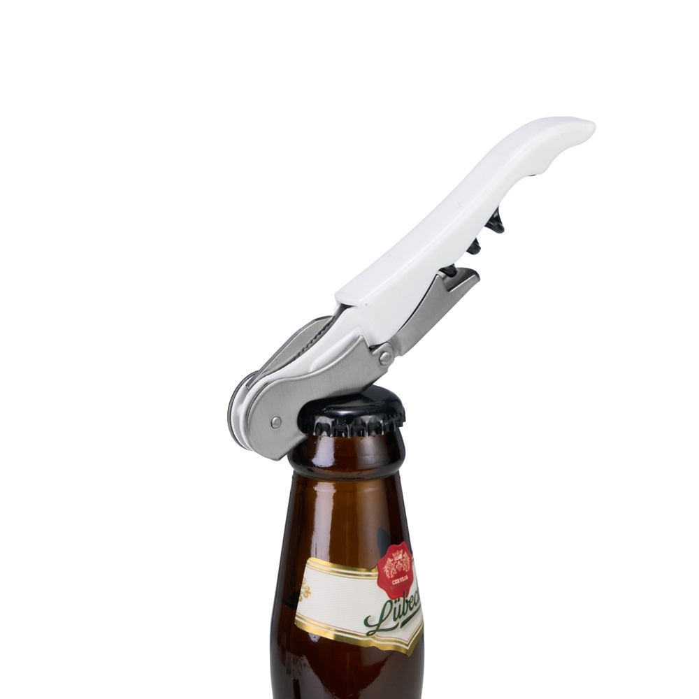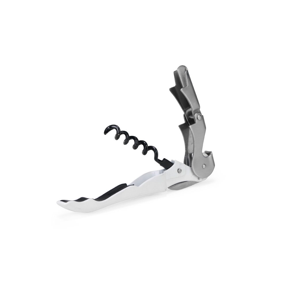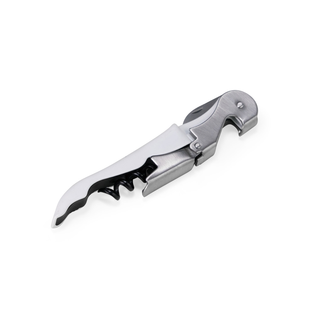 Saca-rolhas metálico personalizado de dois estágios, com acabamento fosco e design funcional. Conta com abridor de garrafas integrado e lâmina retrátil para corte de rótulos, oferecendo praticidade e eficiência em uma única peça. Altura : 12 cm Largura : 2,2 cm