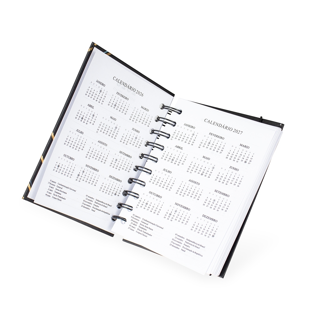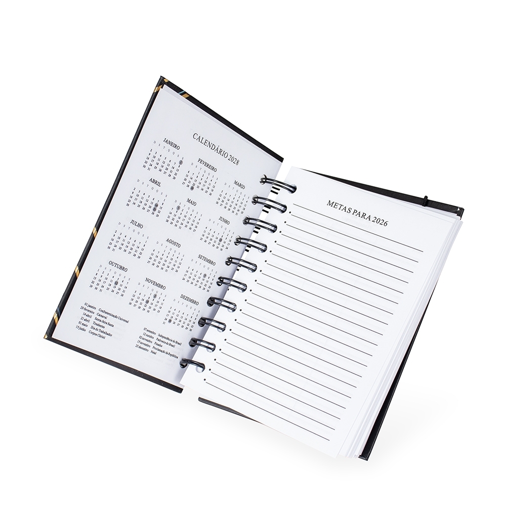 Agenda diária 2026 com capa dura, marcador de páginas em fita de cetim, elástico de fechamento e encadernação Wire-O. Possui páginas para dados pessoais, calendários de 2026 a 2028, listas de metas, planejamento mensal e contatos. Largura : 12 cm Espessura : 2,4 cm Comprimento : 15 cm