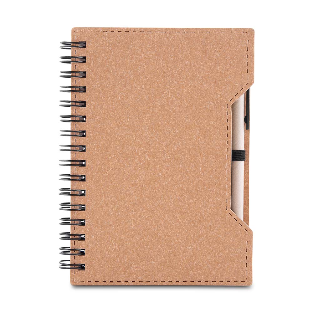 Kit personalizado composto por caderno com capa em papelão e miolo com 70 folhas pautadas em papel 70g/m². Acompanha caneta confeccionada em papelão reciclado com detalhes em plástico.