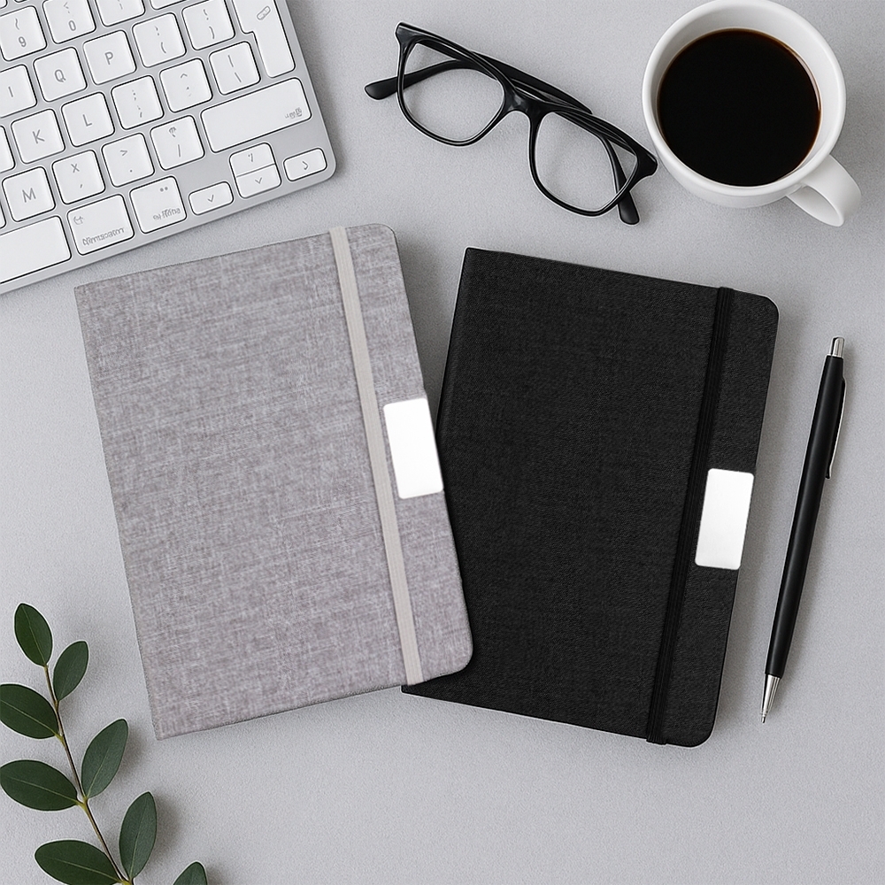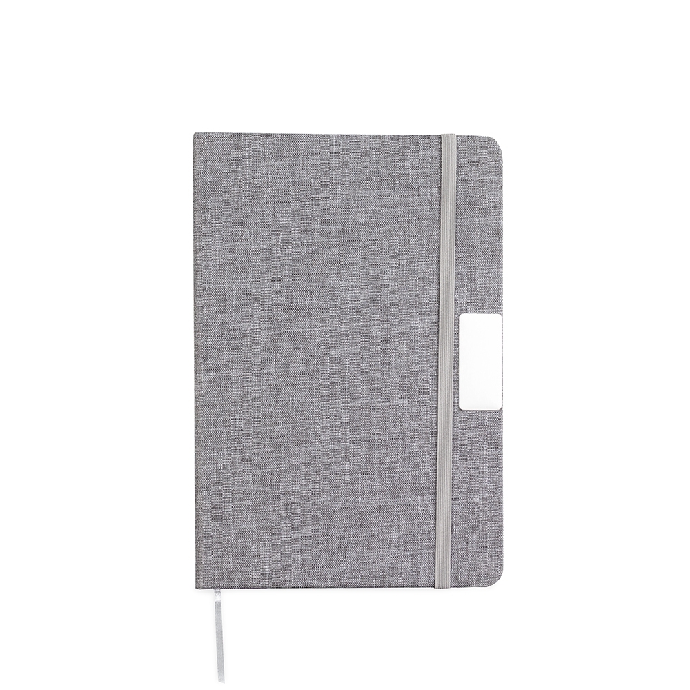 Caderneta personalizada com capa revestida em tecido de algodão, oferecendo um toque confortável e visual moderno para uso corporativo. Possui plaquinha metálica personalizável, elástico para fechamento, marca-páginas em fita de cetim e cerca de 96 folhas marfim pautadas, ideal para anotações, planejamentos e reuniões. Altura : 21 cm Largura : 14,4 cm Espessura : 1,6 cm