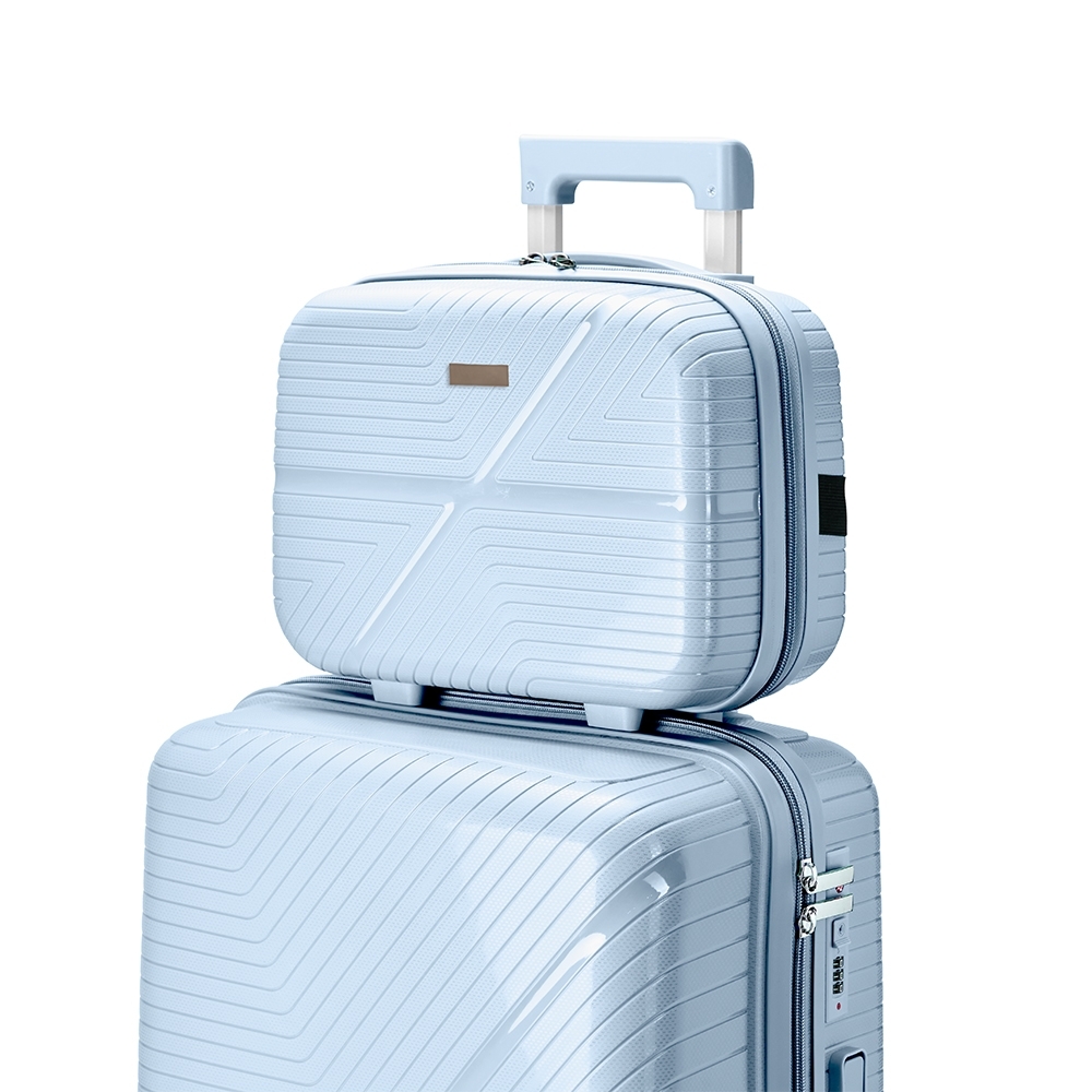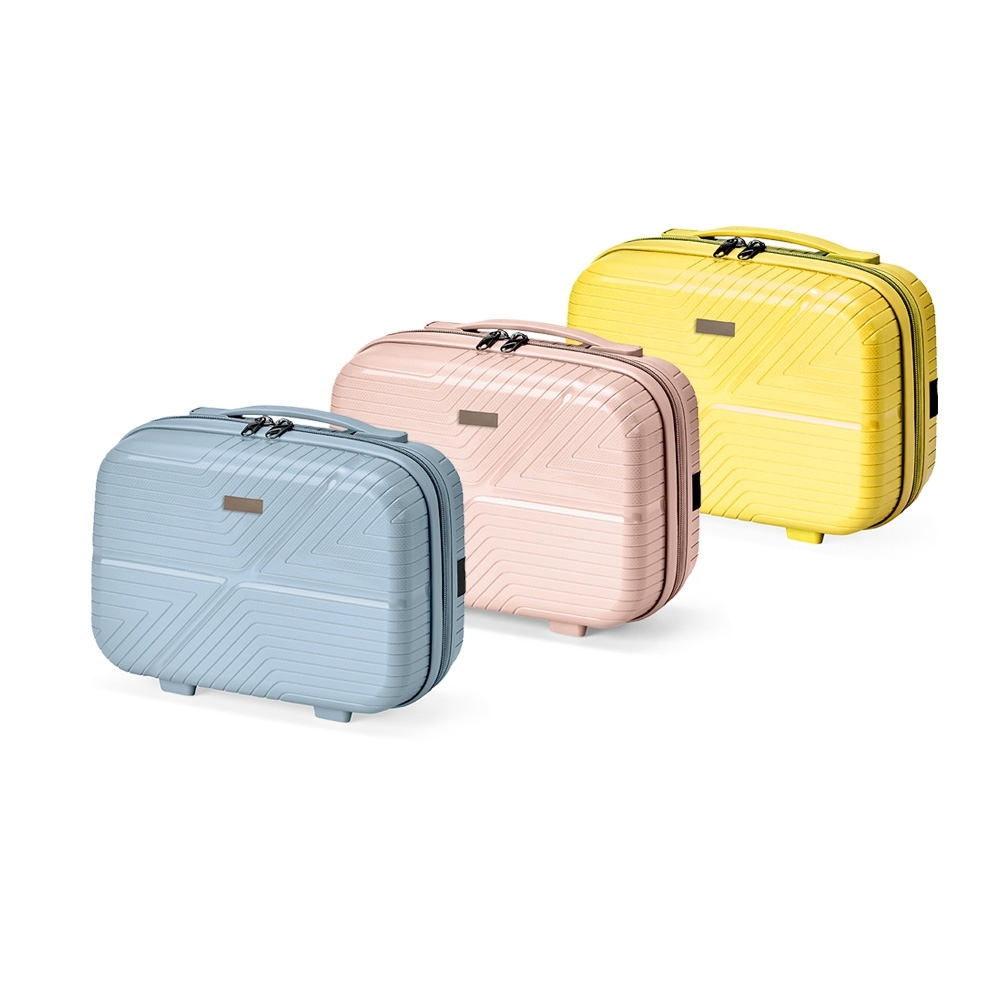 Frasqueira de viagem em plástico rígido com capacidade para até 10 litros. Possui três compartimentos internos, incluindo bolso em tela de nylon com zíper, quatro apoios reforçados na base, alça de mão e elástico traseiro para acoplar em malas maiores. Acompanha placa metálica para personalização.