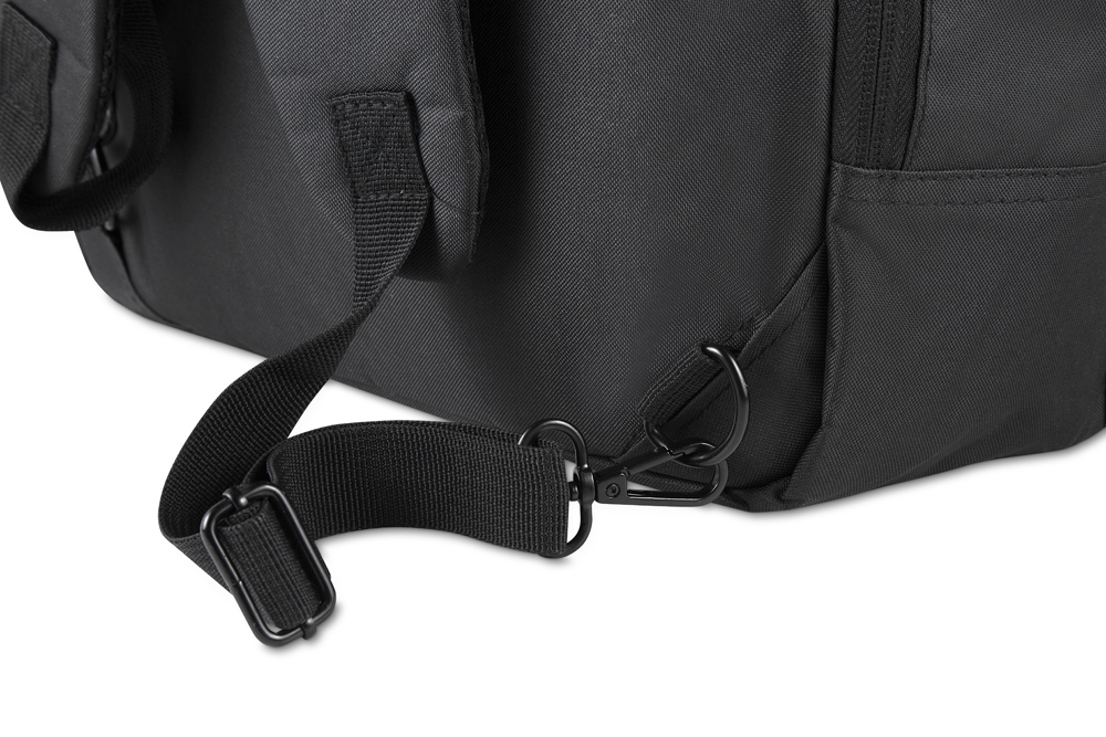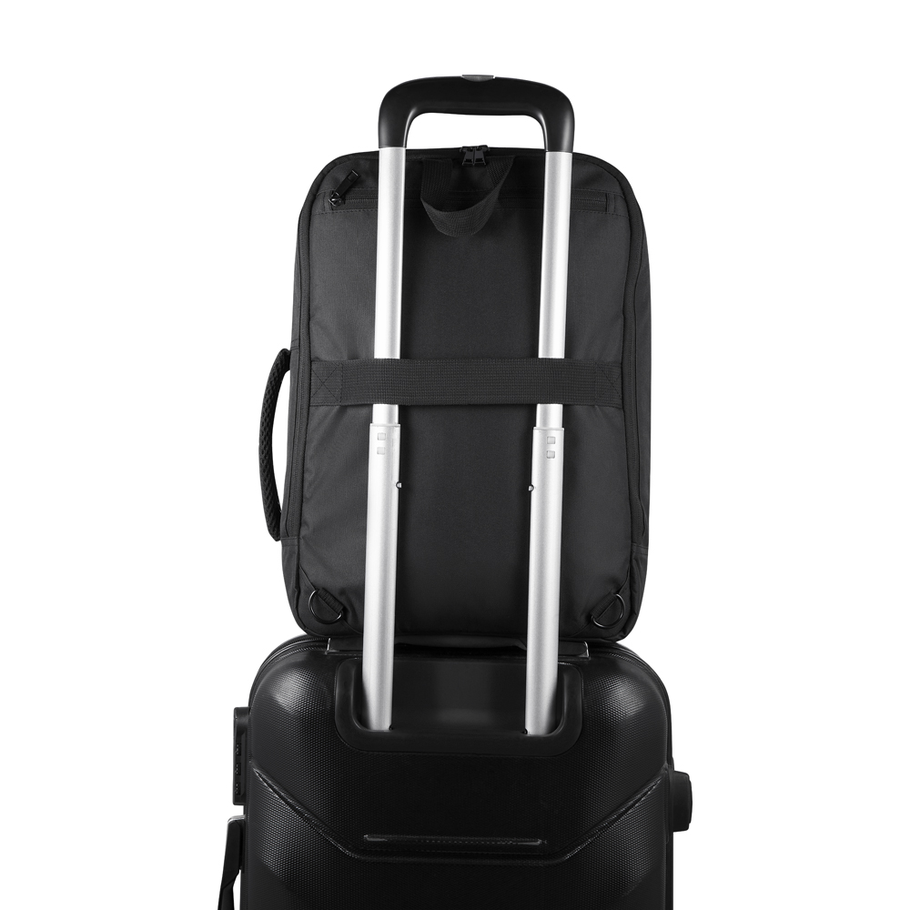 Mochila/pasta personalizada confeccionada em poliéster 300D, com detalhe em PU e interior em poliéster 210D. Conta com alças lateral e de ombro acolchoadas, além de alça de mão e engate para mala de viagem. Possui bolso frontal com zíper, compartimento interno para notebook de até 15,6” e bolso traseiro que permite ocultar as alças, oferecendo versatilidade no uso. Dimensão do Produto: 42x29x12,4cm