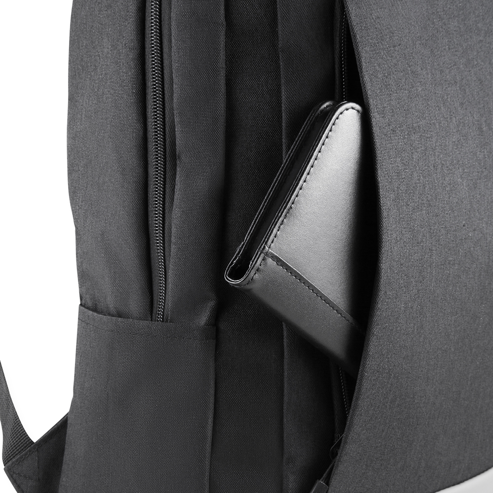 Mochila personalizada confeccionada em poliéster 300D com detalhe em PU no exterior e forro interno em poliéster 210D, oferecendo durabilidade e ótimo acabamento. Conta com capacidade total de 13,5 litros, bolso frontal com zíper, dois bolsos laterais e compartimento interno acolchoado para notebook de até 15,6”. Ideal para empresas que buscam funcionalidade e estilo no dia a dia corporativo. Dimensão do Produto: 45x30x10cm