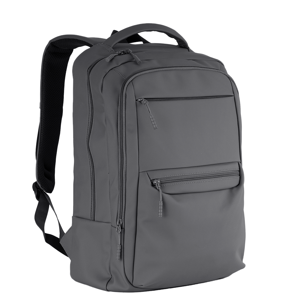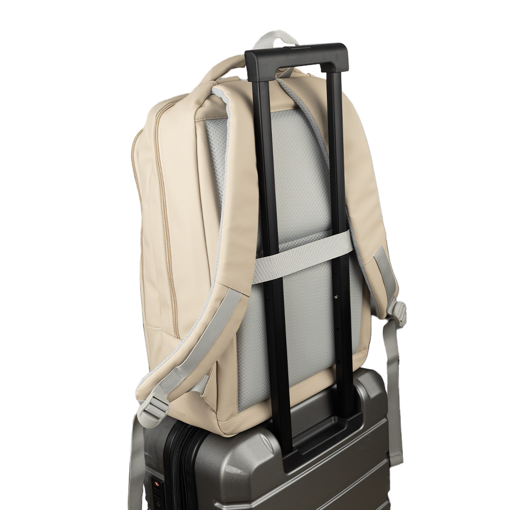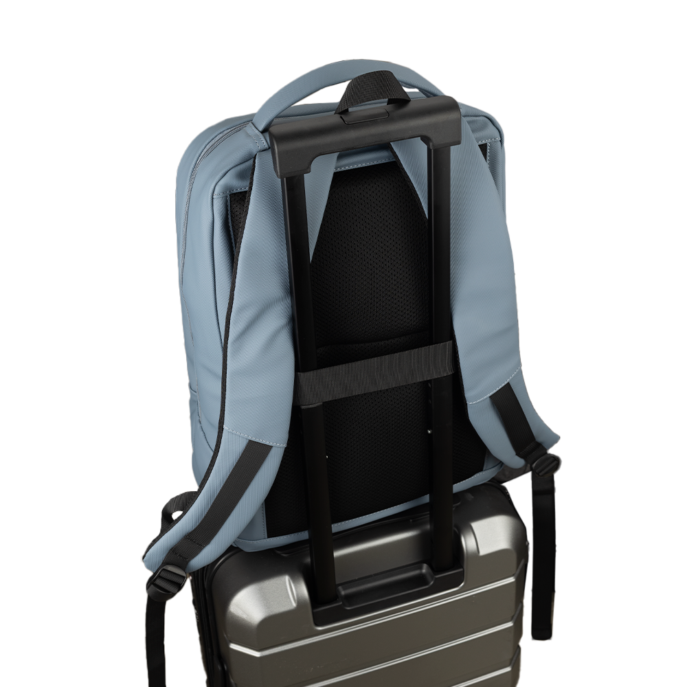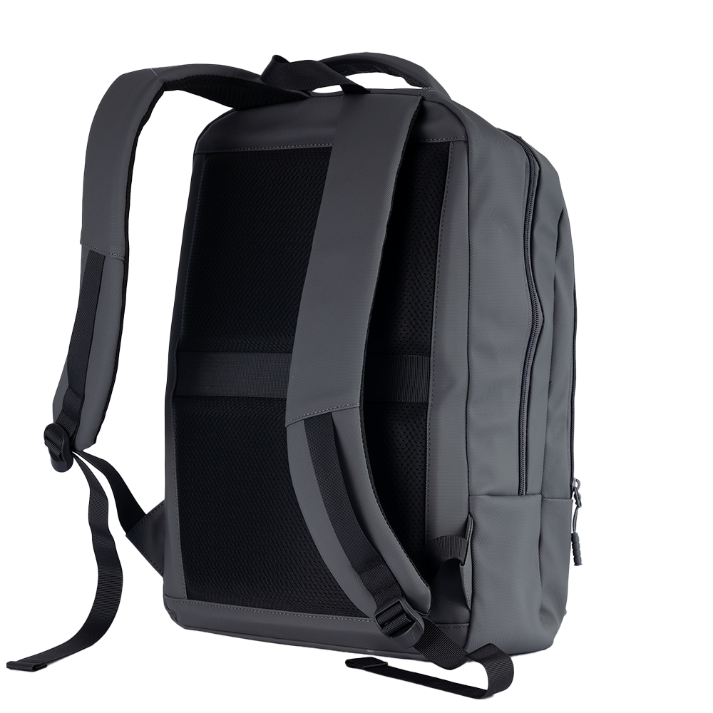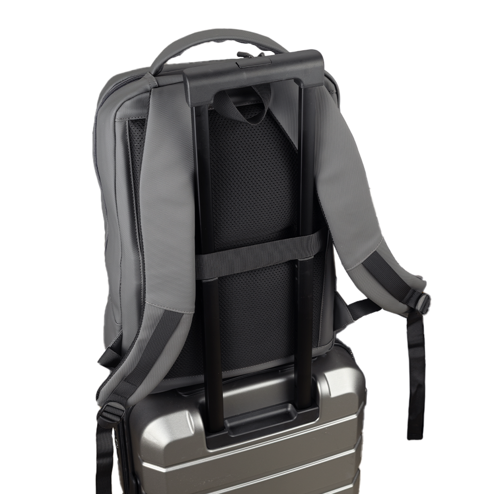 Mochila Move Plus personalizada, confeccionada em material PU resistente à água. Possui compartimento para notebook de até 16", costas e alças com proteção antitranspirante, além de alça de mão rígida e anatômica. Conta também com tira traseira, que permite acoplar a mochila com segurança à alça de uma mala de bordo, facilitando o transporte em viagens.